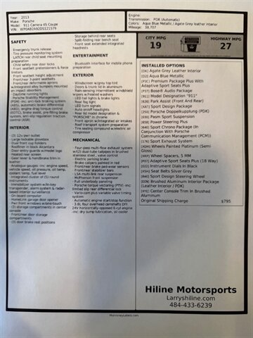 APPOINTMENT ONLY. See Full Listing: LARRYSHILINE.COM Carfax Certified C4S in SHOWROOM condition. MSRP $140K. OVER $33K in OPTIONS. RARE FACTORY AEROKIT. NO PAINTWORK. WARRANTY. COLLECTOR CAR. 2013-2016 are the EXACT same cars. UPDATES PRIOR TO SALE: 4 NEW TIRES, NEW FRONT BRAKES & ROTORS, UPDATED ENGINE MOUNTS WHICH WILL NOT FAIL LIKE THE ORIGINAL PORSCHE DESIGN WHICH WILL COST OVER $6,000 TO REPLACE. ANY CAR WITHOUT THIS UPGRADE WILL COST YOU REPEATEDLY. We specialize in Porsche so UNLIKE other cars being offered at a discount, this 911 DOES NOT have a Rear Main Seal Leak, Engine Issue, Over Revs, Bent Rims, Poor Repairs, LCD Issue, Glaring Imperfections or any other commonly known issue which is expensive to repair or compromises value. WE VALIDATE AND/OR FIX THESE ITEMS IN HOUSE. THESE ITEMS WILL COST YOU MORE THAN ANY PRICE NEGOTIATION EVER COULD. A BOOK VALUE CANNOT ACCOUNT FOR ITEMS IN DISREPAIR WHICH CAN COST THOUSANDS. WE DO NOT CHARGE ELEVATED DOC FEES OR PROFIT FROM FINANCING. WE WARRANTY ALL OF OUR CARS IN HOUSE. PLEASE CONSIDER ALL VARIABLES WHEN ACCOUNTING FOR PRICE! Features: VIEW WINDOW STICKER PHOTO FOR OPTIONS. Unlike other Porsches being offered at a discount, this 911 is in impeccable condition. The original paint shines like new without any noticeable imperfections. The rims are free of curb rash. The NON-SMOKER interior is in pristine shape. CAR STILL SMELLS NEW. We have always specialized in Porsche & provide service for any car we sell. Our tech noted the undercarriage is impeccable without any seaps, drips, leaks or corrosion. We are selling the car with a 3 Month Limited Warranty. Please read our reviews on previously sold cars. Buy from an experienced seller who Inspects, Validates, Updates & Facilitates.**Unlike other dealers, we do not have any car salesman trying to talk you into a car. We rather pay experienced mechanics to assess, fix & update your car. We WARRANTY all of our cars. Our cars do not have any leaks, dash lights or glaring imperfections. All of our cars are sold with current PA Inspection/Emissions. We do not profit from inflated doc. fees or increased APR charges on bank loans. We have always specialized in what we sell so we are most concerned with assessing, fixing & updating the car you are buying which incurs the greatest expense & time. These are used cars not new so mechanical & cosmetic assessments are subjective. Our reputation & reviews are indicative of our business model. Our 20 years of experience in specializing in what we sell saves our customers far more than any price negotiation. If your buying decision is based solely on price, then you will most certainly get what you pay for. Advertising vendors are enticing buyers by stating best deal which is entirely dependent upon price, not accounting for the car's mechanical and/or cosmetic condition. Our best advice is to buy from an experienced seller who knows the prone to failure items with the type of car you are considering & has experienced in house mechanics to repair/update the car prior to your purchase. We also provide service for our customers at a discounted rate.