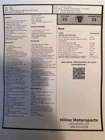 - It is the buyer’s responsibility to confirm the MSRP and options of the vehicle they purchase prior to taking possession of the vehicle. Buyers must disregard the Vehicle Features & Options Standard Features at the bottom of the listing. These options are VIN decoded, so Hiline has no way of changing. Hiline lists the car's options in the description section only. Hiline does its best to ensure these items are listed accurately. However, mistakes can occur between the time the dealer takes possession of the car, and the time that the car is sold, both in or out of favor of the buyer. This is because there are instances where specific options could have either been added to or removed from a car after the original purchase, and this information was not disclosed to the seller. It is also possible that the seller could have failed to include an option or added an option in error when listing the vehicle. In the majority of circumstances, the added or accidentally-included item will be very minor (such as the presence of slotted rotors, parking sensors, automatic spoiler, backup camera or blue-tooth capabilities). The car may be listed to include navigation if the car has a factory ready head unit, but it is important for the buyer to confirm the inclusion of the item with the seller prior to purchase. We are not responsible for omitted items which may have been coded out or deleted from the previous owner such as tire pressure sensors, blue-tooth accessories, activated rear spoilers, parking sensors, blind spot features, cameras, headlight washers, cornering headlights or comfort features. If these items do not cause any obvious faults then we are have no way of determining such changes.